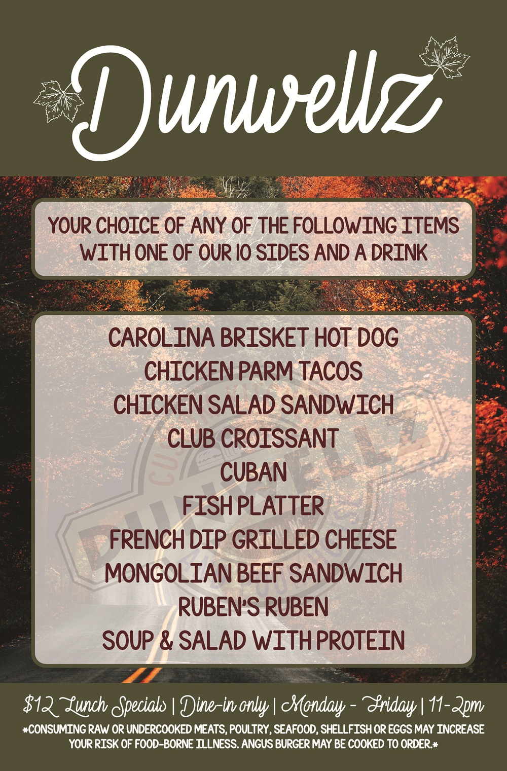 Main Menuz Fall $12 Lunch Specials (Mon – Fri) Food Menuz View/Print Menu Main Menuz » Fall $12 Lunch Specials (Mon – Fri) » Proudly serving Boar’s Head deli meats and cheeses and custom baked breads from two local bakeries. 18% gratuity added for parties of 7 or more Drink Menuz View/Print Menu Liquor List » Beer List » Daily Specials » Drink Menuz »